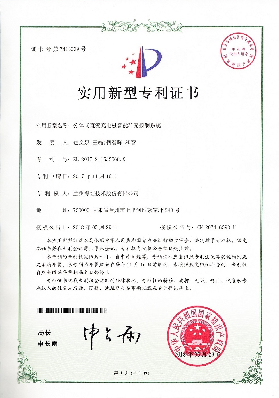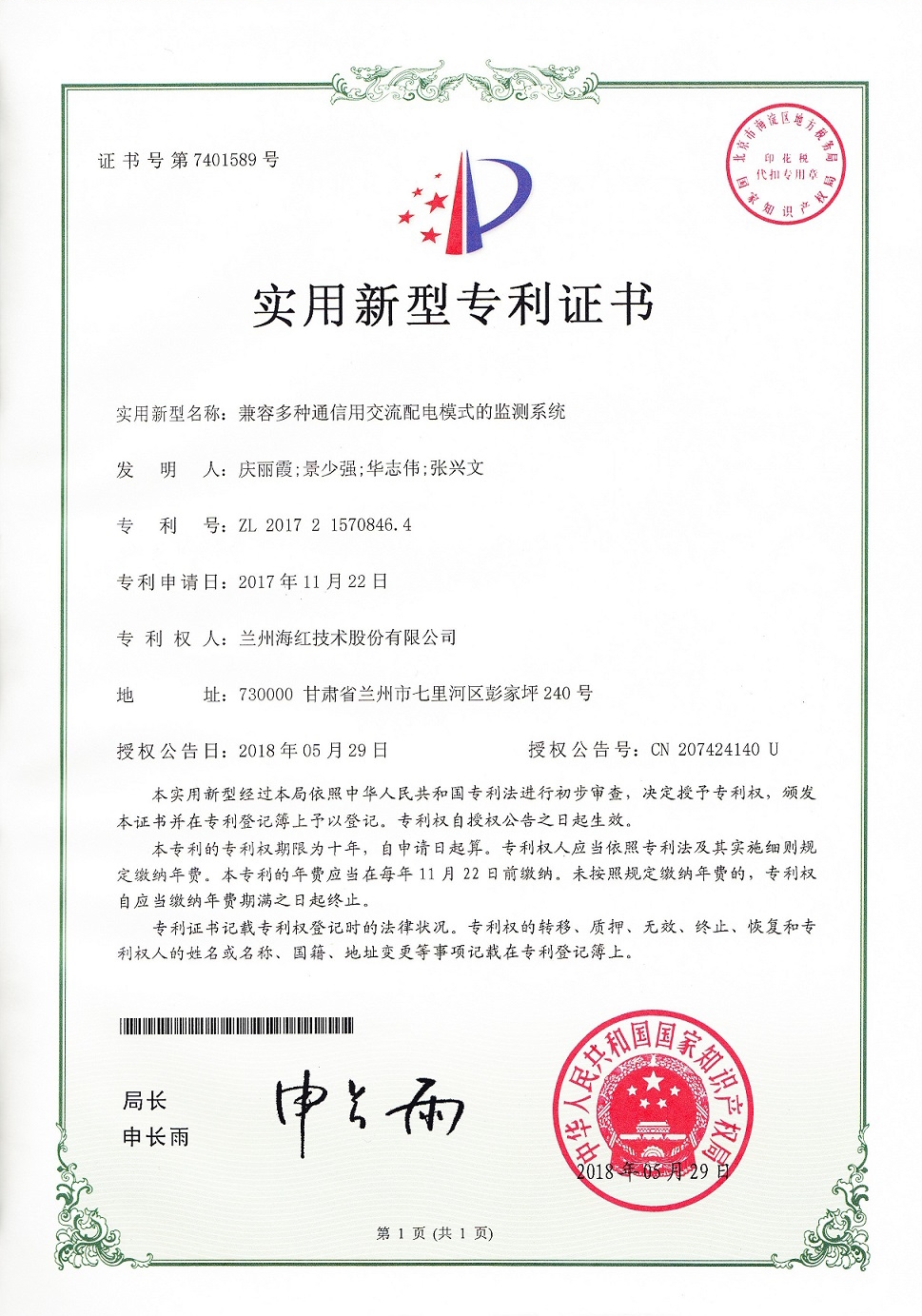 我公司又取得四項(xiàng)實(shí)用新型專利,至此我公司申請(qǐng)受理的專利數(shù)累積84項(xiàng)(其中發(fā)明專利17項(xiàng),實(shí)用新型專利56項(xiàng),外觀設(shè)計(jì)專利3項(xiàng),軟件著作權(quán)8項(xiàng)),已獲得授權(quán)59項(xiàng)(其中發(fā)明專利8項(xiàng),實(shí)用新型專利40項(xiàng),軟件著作權(quán)登記8項(xiàng),外觀設(shè)計(jì)專利3項(xiàng))。
