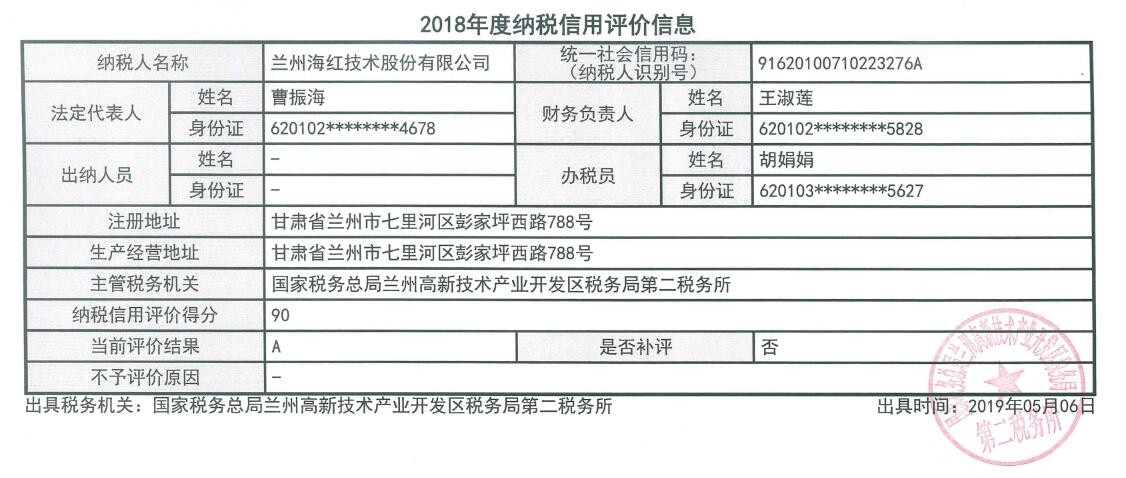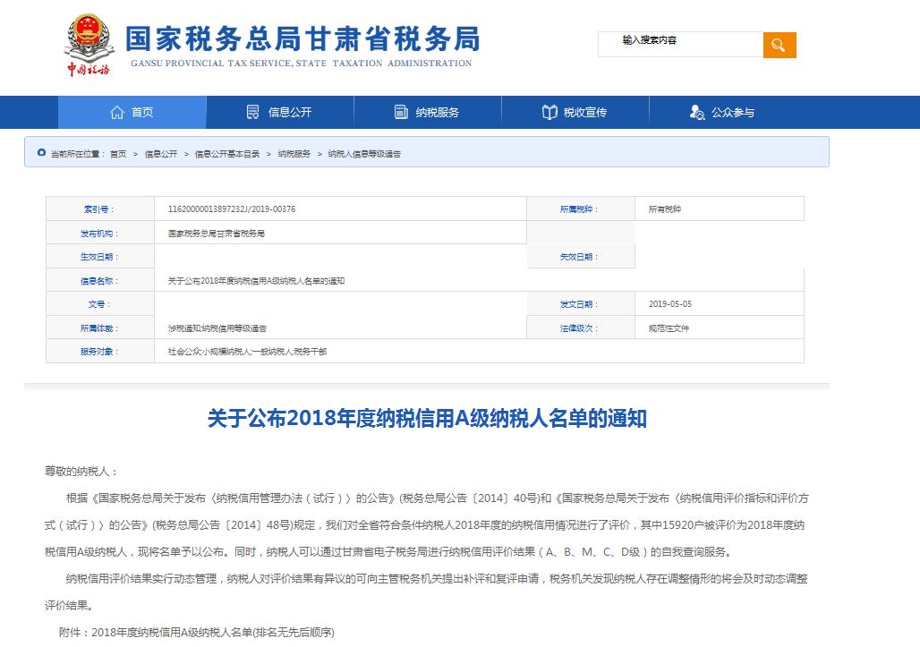 我公司被國家稅務總局甘肅省稅務局評價為“2018年度納稅信用A級納稅人”