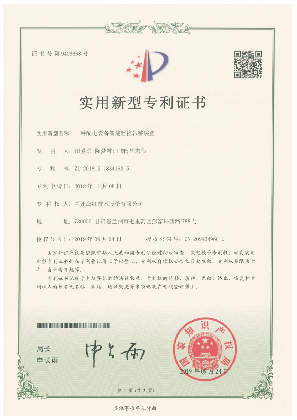 我公司再次取得一項實用新型專利 By 海紅技術(shù) 2019-11-20 08:46:14 0次 我公司再次取得一項實用新型專利,至此我公司申請受理專利與軟件著作權(quán)登記累積103項,已獲得授權(quán)79項(其中發(fā)明專利10項,實用新型專利57項,軟件著作權(quán)9項,外觀設計專利3項)。 上一篇:我公司參與起草的行業(yè)標準《通信機房用光纖槽道》已正式出版 下一篇:“全省中小企業(yè)負責人質(zhì)量基礎能力提升培訓班”學員來我司參觀考察