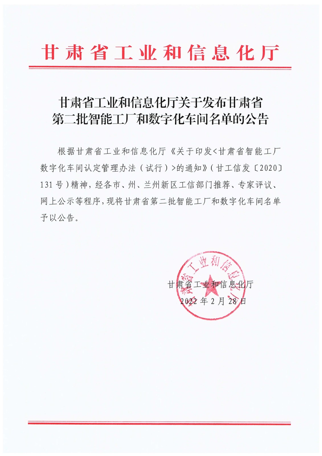 甘肅省工業(yè)和信息化廳發(fā)布甘肅省第二批數(shù)字化車間名單公告,我司鈑金車間被認定為甘肅省第二批“數(shù)字化車間”。