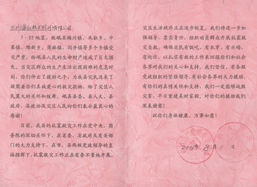 一封來自定西地震災區(qū)的感謝信
