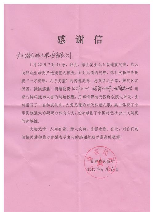 8月初,蘭州海紅技術股份有限公司收到了來自甘肅省民政廳、岷縣人民政府的感謝信。